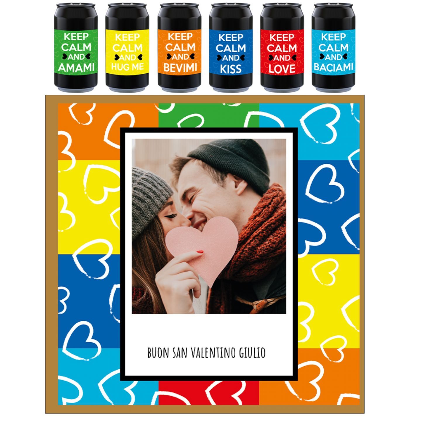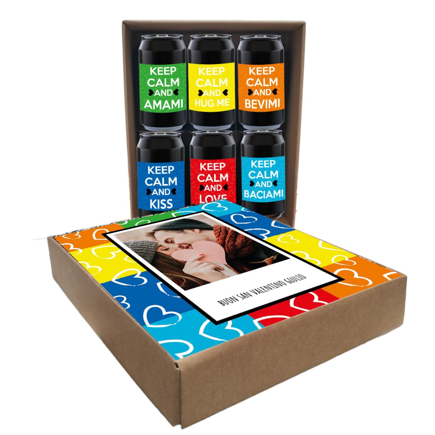 6 lattine 0.33 lt. – Birra Artigianale Amber Ale con etichetta personalizzata e scatola con coperchio personalizzato per SAN VALENTINO. Aggiungi la tua personalizzazione e usa il coperchio come quadro-fotografico! Sorprendi la tua dolce metà per il prossimo 14 febbraio!